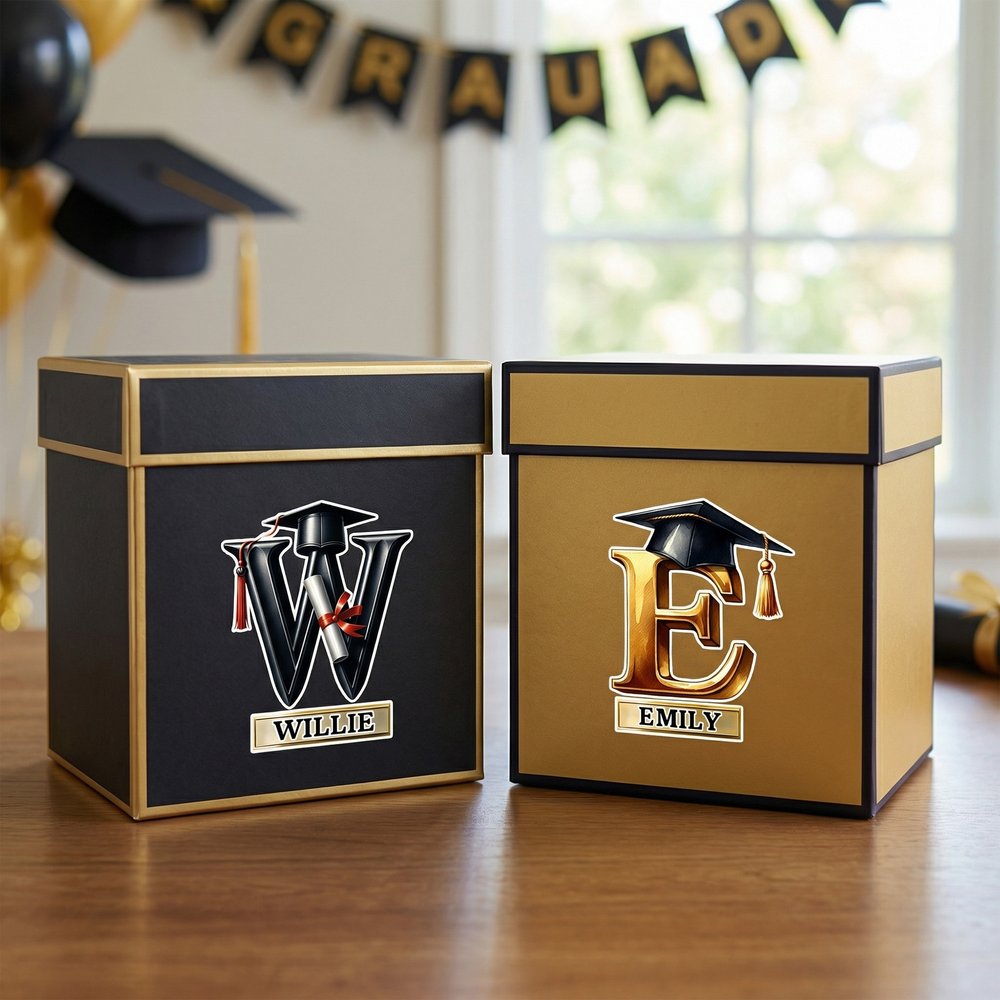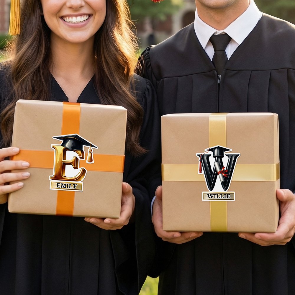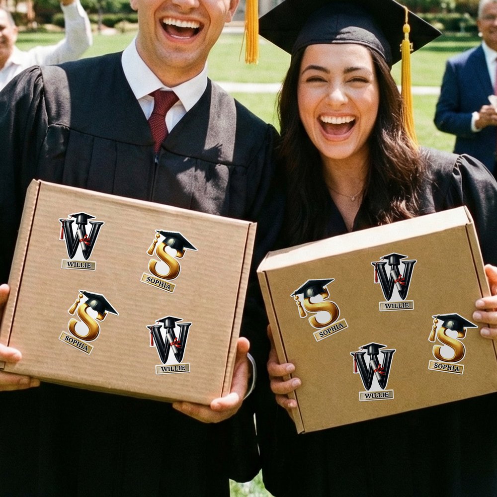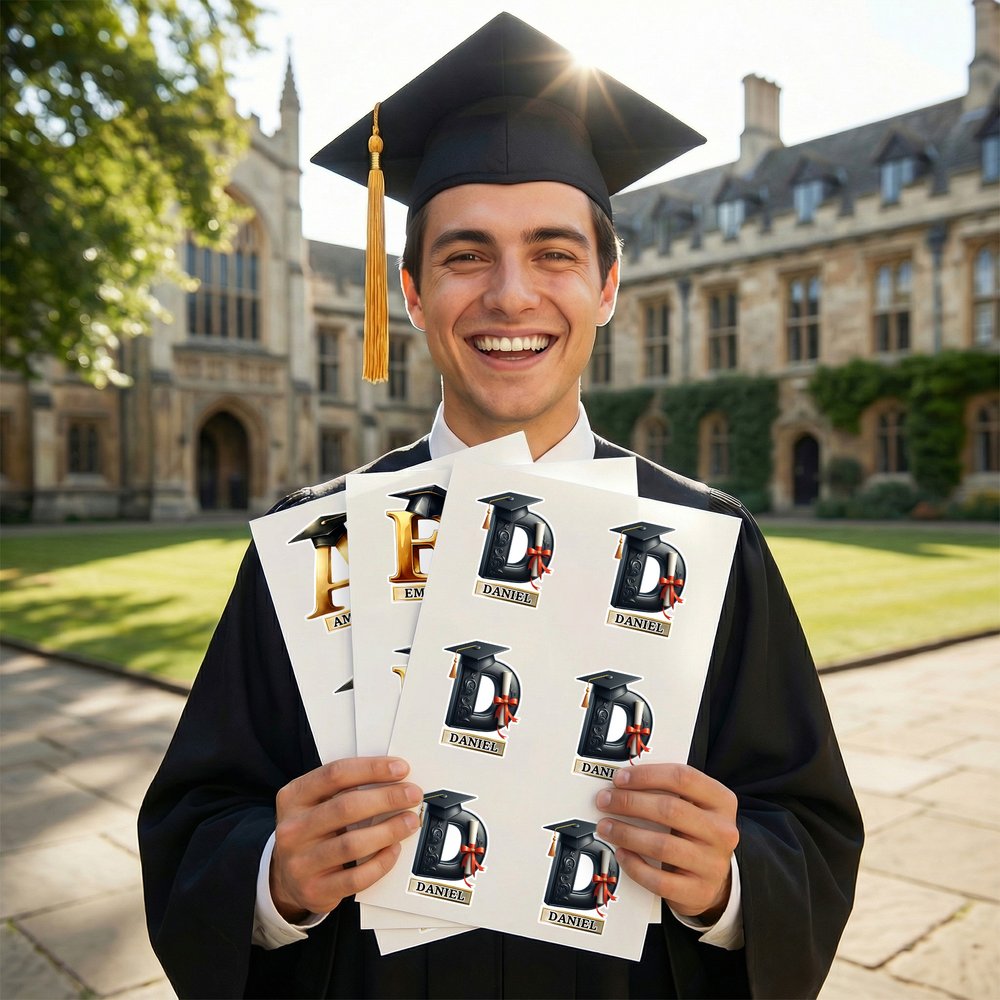 Prosty, przejrzysty i wysoce spersonalizowany projekt z inicjałami czapek absolwentów jako głównym elementem w połączeniu z konfigurowalnymi imionami. Elegancki układ tekstu doskonale uzupełnia motyw ukończenia szkoły, czyniąc każdą naklejkę wyjątkową.