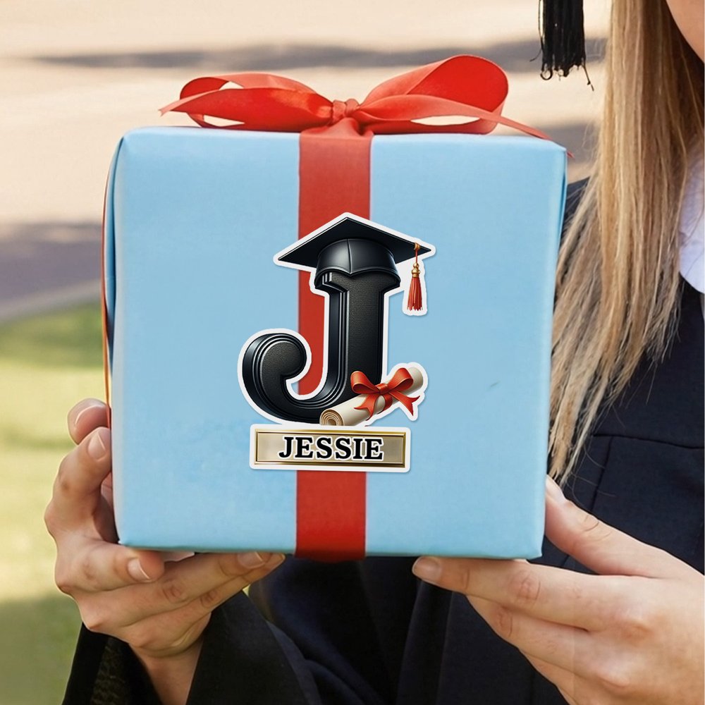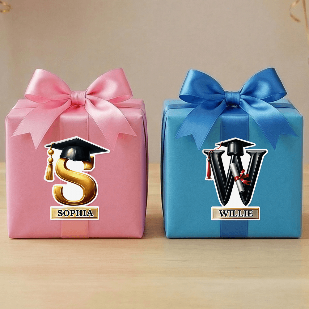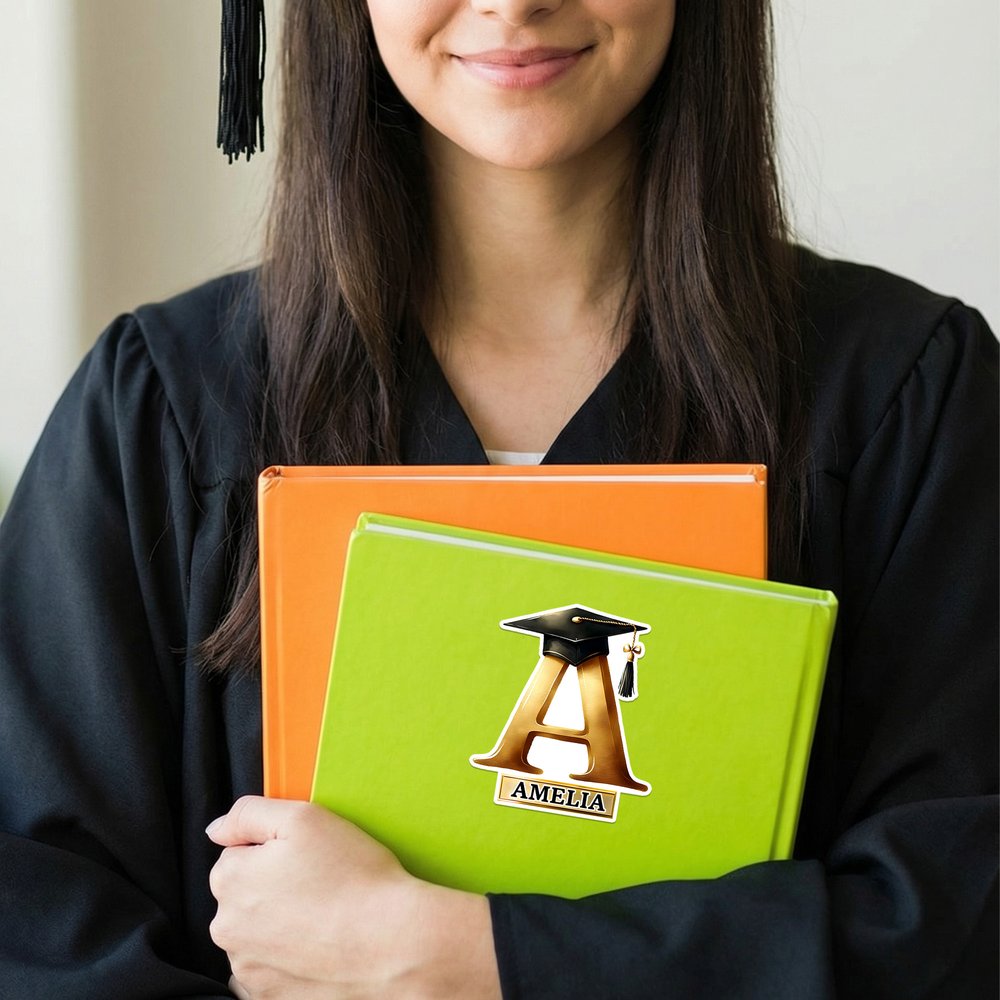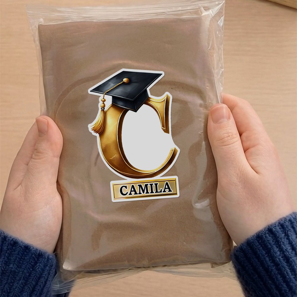 Prosty, przejrzysty i wysoce spersonalizowany projekt z inicjałami czapek absolwentów jako głównym elementem w połączeniu z konfigurowalnymi imionami. Elegancki układ tekstu doskonale uzupełnia motyw ukończenia szkoły, czyniąc każdą naklejkę wyjątkową.